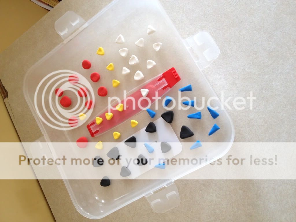 Tout ça pour dire que, aujourd'hui, j'ai confectionné des formes avec de la pâte à modeler qui sèche à l'air. Je me suis inspirée de la grammaire Montessori pour construire du matériel manipulable et ludique, afin de réduire la monotonie de la tâche pour Alexis. Pour celles qui ne connaissent pas la pédagogie Montessori, il s'agit en fait de représenter chacune des parties de la phrases par une forme et une couleur (par exemple chez moi, le nom est un triangle noir, le verbe un rond rouge, etc.) afin de permettre à l'enfant de déplacer ces éléments et de former des phrases qui sont bien construites.